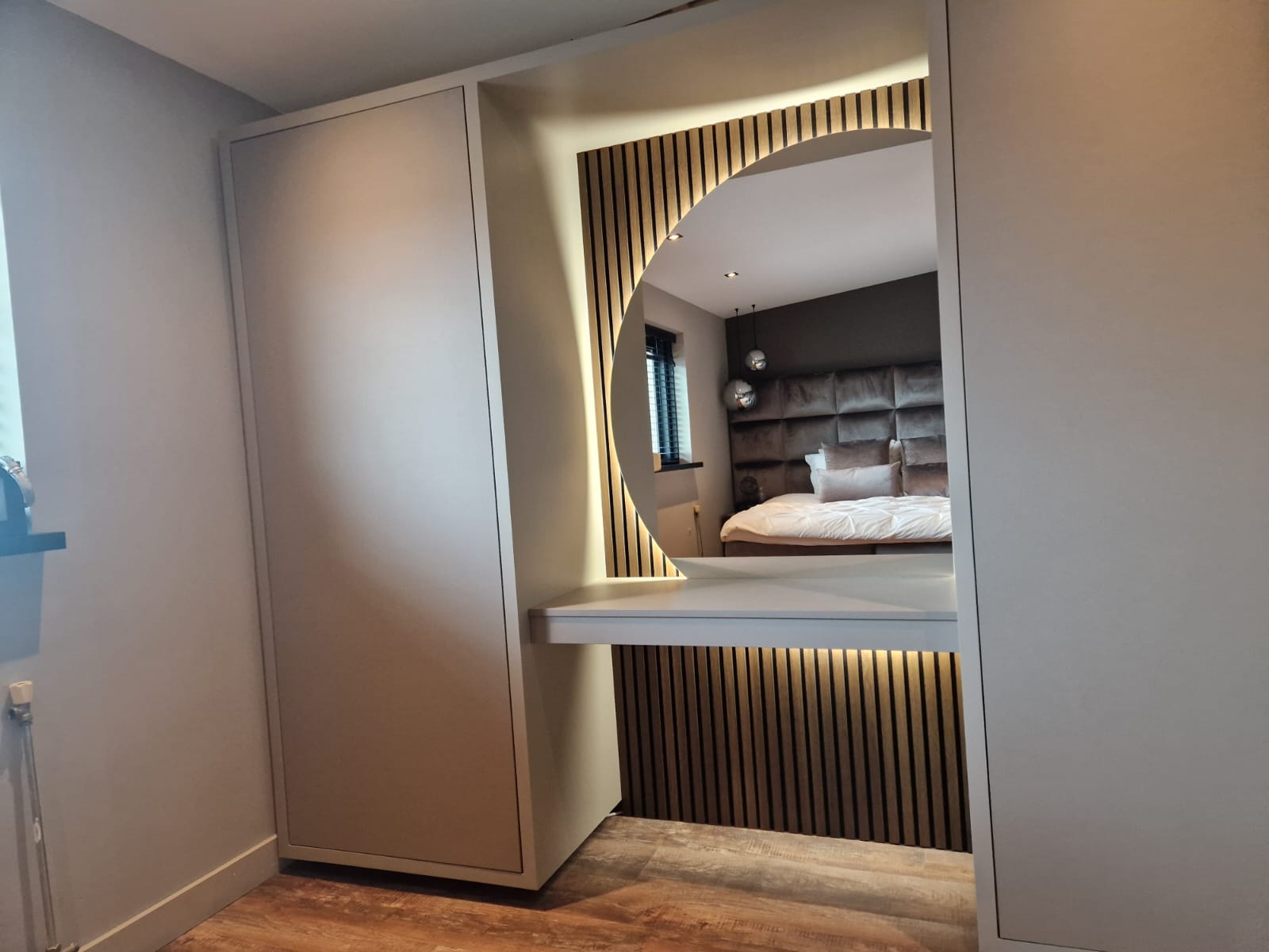 In deze master bedroom hebben we een rustige en warme sfeer gecreëerd. Om het geheel één uitstraling te geven, is gekozen voor een taupekleurige maatwerkkast met stoere leren decordeuren. Op wens van de klant is er ruimte gemaakt voor een kaptafel, compleet met een half ronde spiegel met geïntegreerde ledverlichting. Een eiken lat-om-lat paneel geeft de ruimte een luxe en eigentijdse uitstraling.