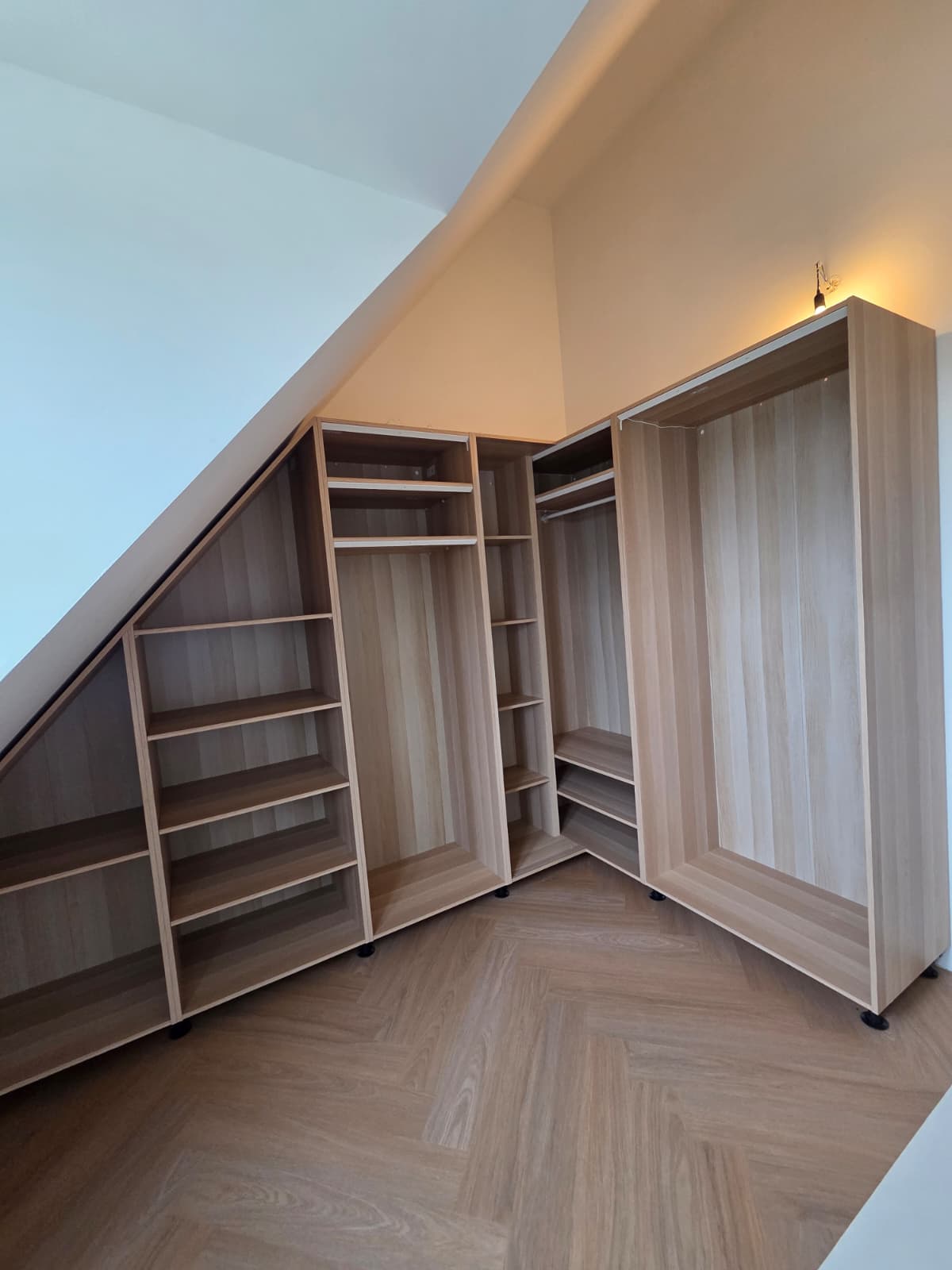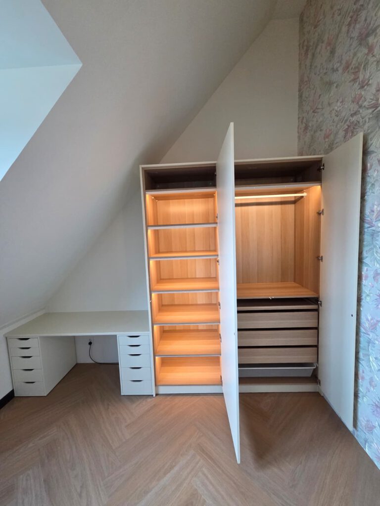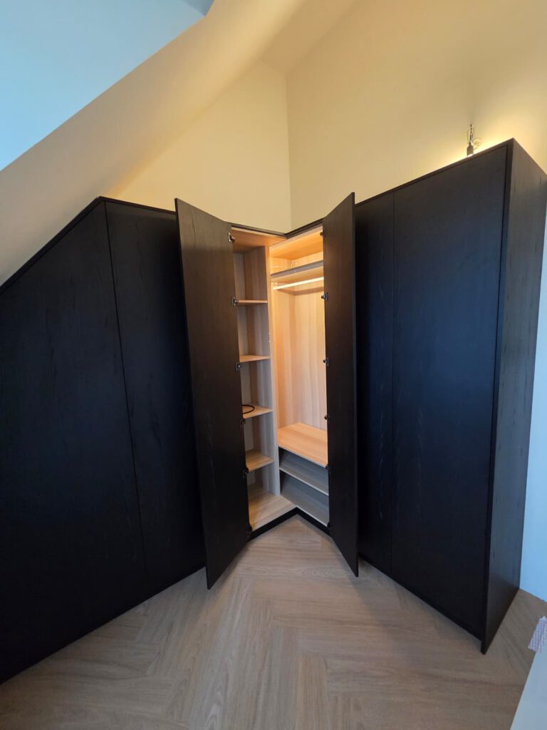 Voor dit project zijn meerdere maatwerk kasten ontworpen en gerealiseerd onder een schuin dak, volledig afgestemd op de ruimte en het gebruik.